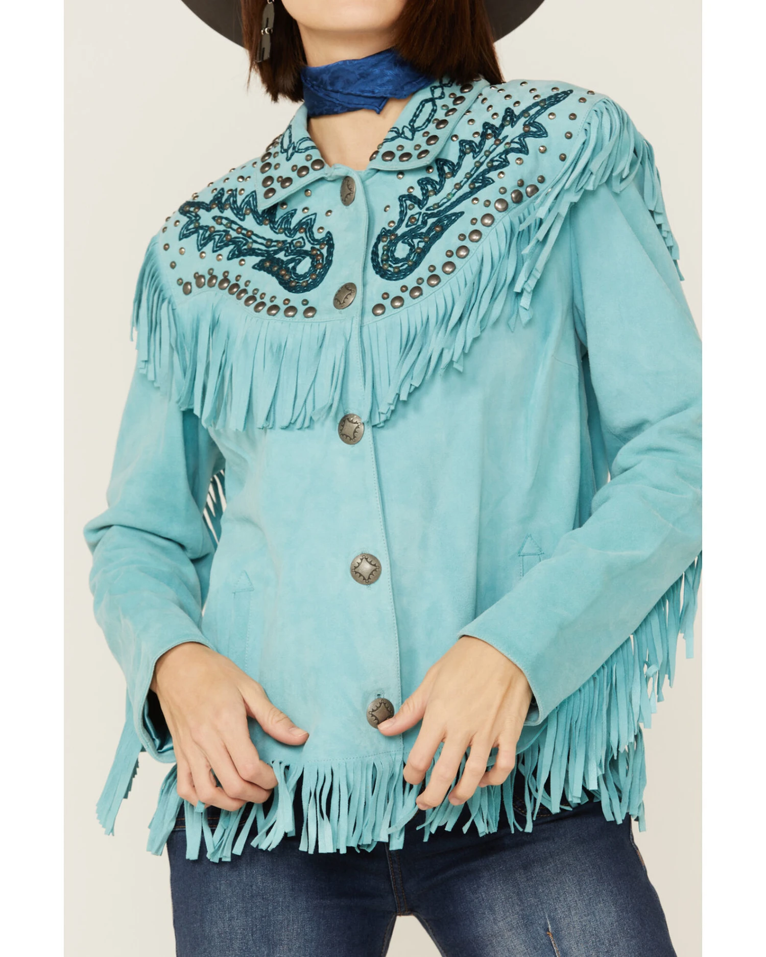 - Western yokes with Southwestern embroidered, fringe, and studded trim details