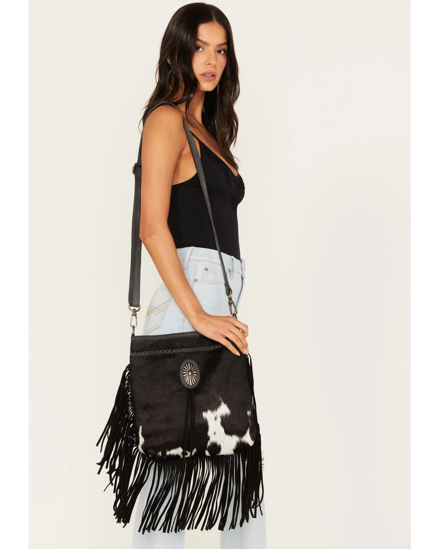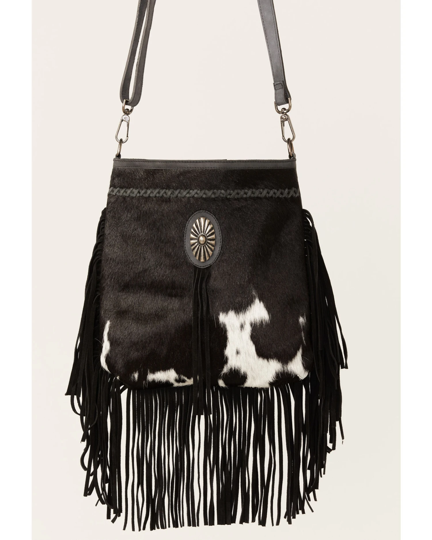 - Braided stripe and oval concho with fringe detailing on front